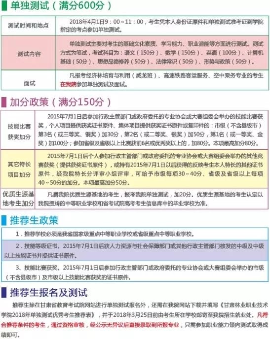 品行端正,身心健康,并符合2018年甘肃省普通高等学校招生体检要求和我院2018年单独测试相关专业规定的招生条件。